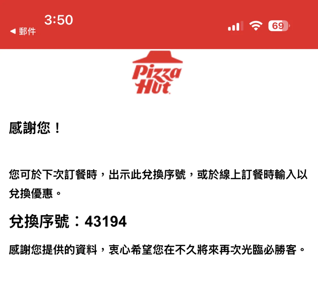 - 可於必勝客網站「為必勝客評分優惠兌換」區輸入序號